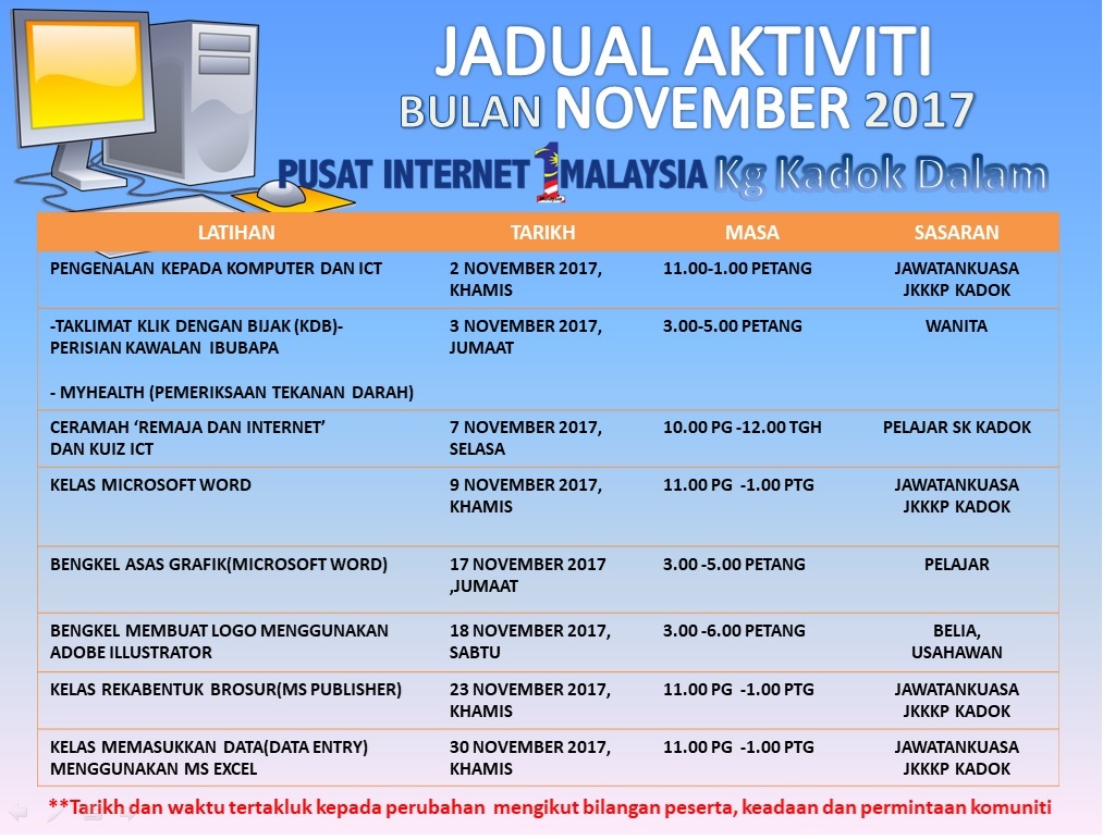Tarikh : 3 November 2017 Masa : 3.00 petang – 5.00 petang Lokasi : Bilik Latihan Pusat Internet 1Malaysia Kg Kadok Dalam Peserta : 6 orang Tujuan Program ini dihadiri oleh 6 orang peserta terdiri daripada 6 orang dewasa. Tujuan […]